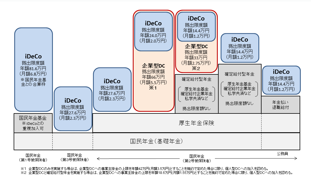 今年の1月から制度が少し変わり公務員の方や会社が確定拠出年金掛けてくれている会社員の方も個人型にも加入できるようになりました。