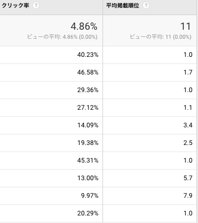 つまりクリック率の平均は4.86%、平均掲載順位が11位となっています。
